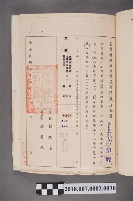 文鍵臺灣省政府主計處中華民國58年考績(成)通知書 -