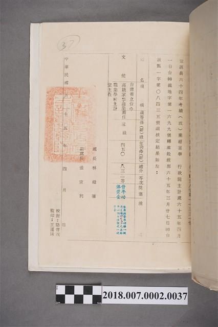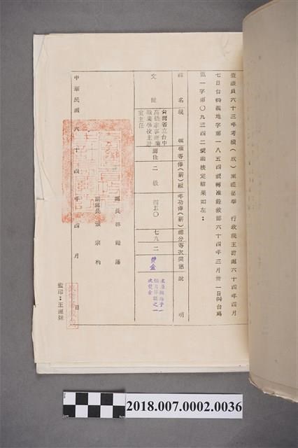 文鍵臺灣省政府主計處中華民國64年考績(成)通知書