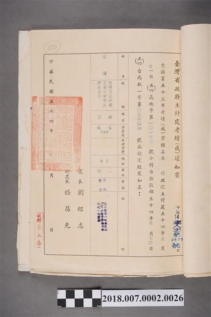 文鍵臺灣省政府主計處中華民國54年考績(成)通知書 -