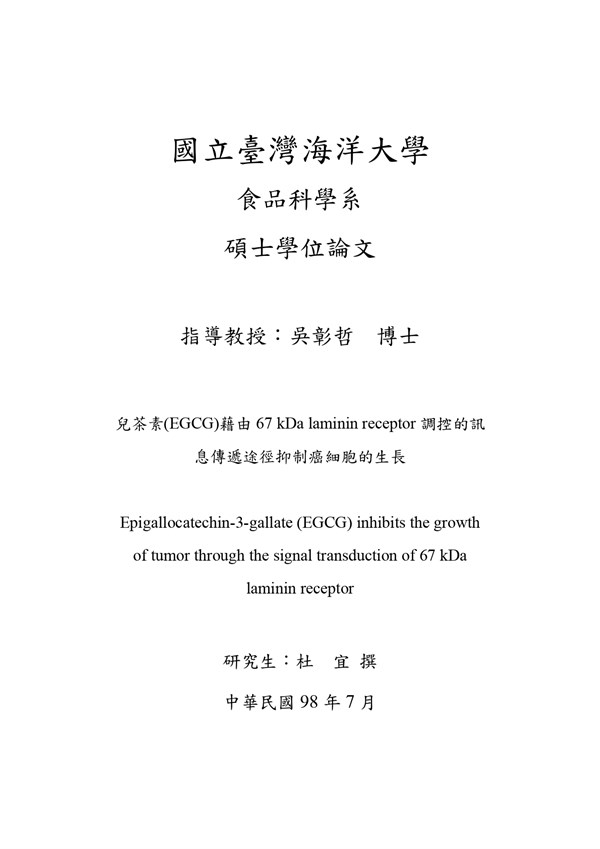 兒茶素(EGCG)藉由 67 kDa laminin receptor 調控的訊息傳遞途徑抑制癌細胞的生長 -