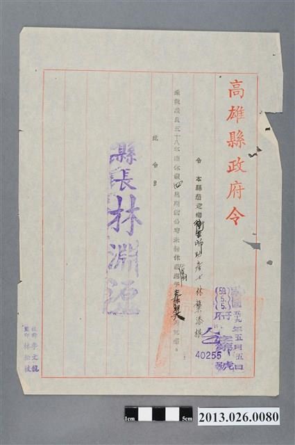 1956年臺灣省政府對高雄縣茄萣鄉長林森源辦理44年度第一期田賦實物征收工作努力記嘉獎一次之訓令 -