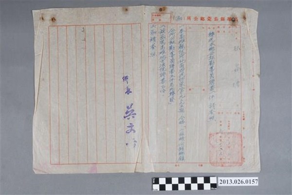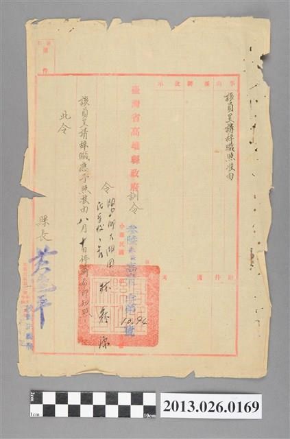 戰後初期臺灣省行政長官公署派林森源為高雄縣湖內鄉大湖國民學校校長之委任令 -