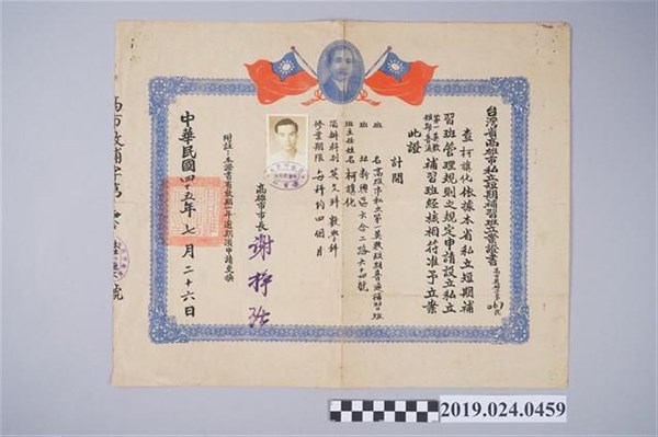 1956年7月26日柯旗化收到台灣省高雄市私立短期補習班立案證書 -