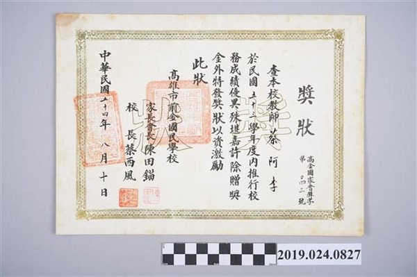 蔡阿李1965年高雄前金國小家長會嘉許推行校務優異獎狀