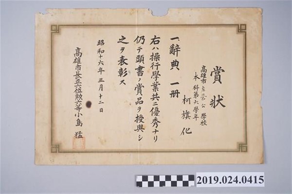 1941年3月12日柯旗化高雄市左營公學校本科第六學年操行學業優秀賞狀 -