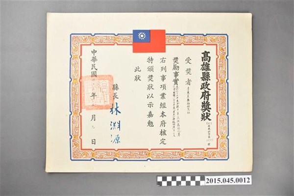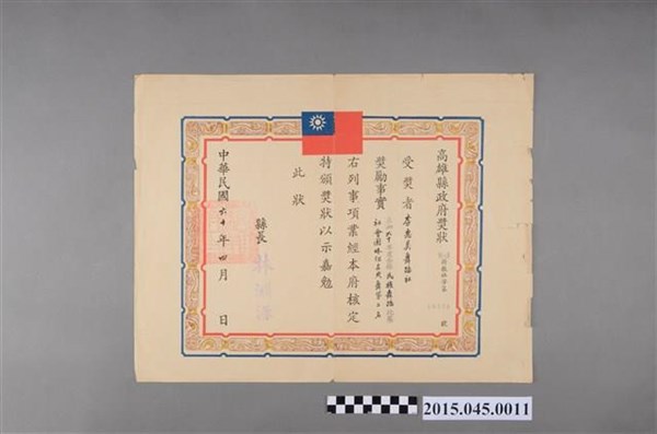 高雄縣政府表彰李惠美辦理五十七年度社教工作成績優良獎狀 -