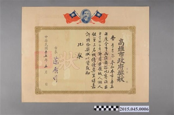 李惠美女兒李孝芬參加高雄市五十五年度民族舞蹈比賽成人個人組第三名獎狀 -