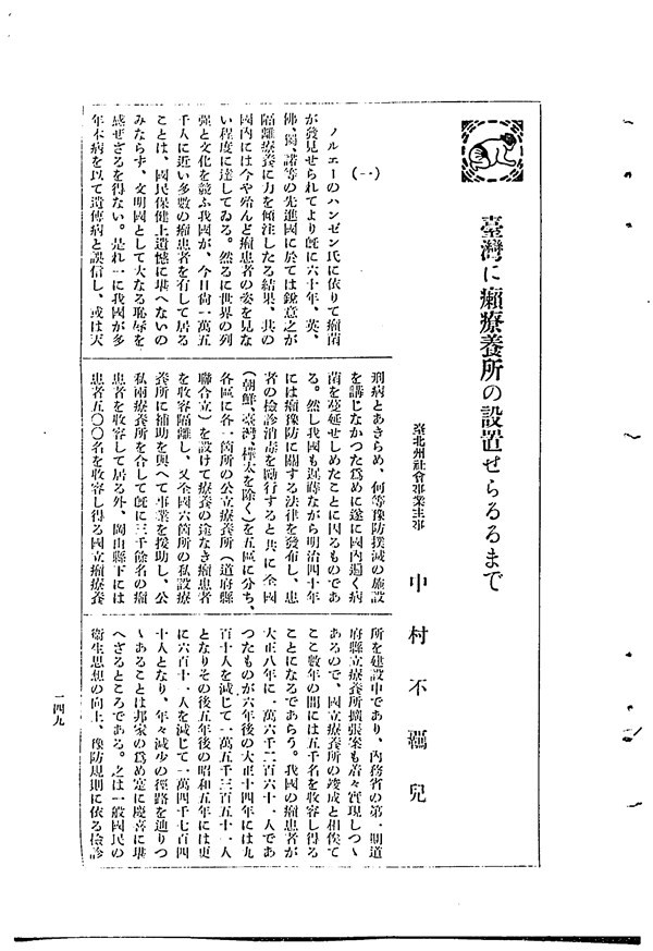 臺灣に癩療養所の出來るまで(中文:直到臺灣設置癩病療養所) -