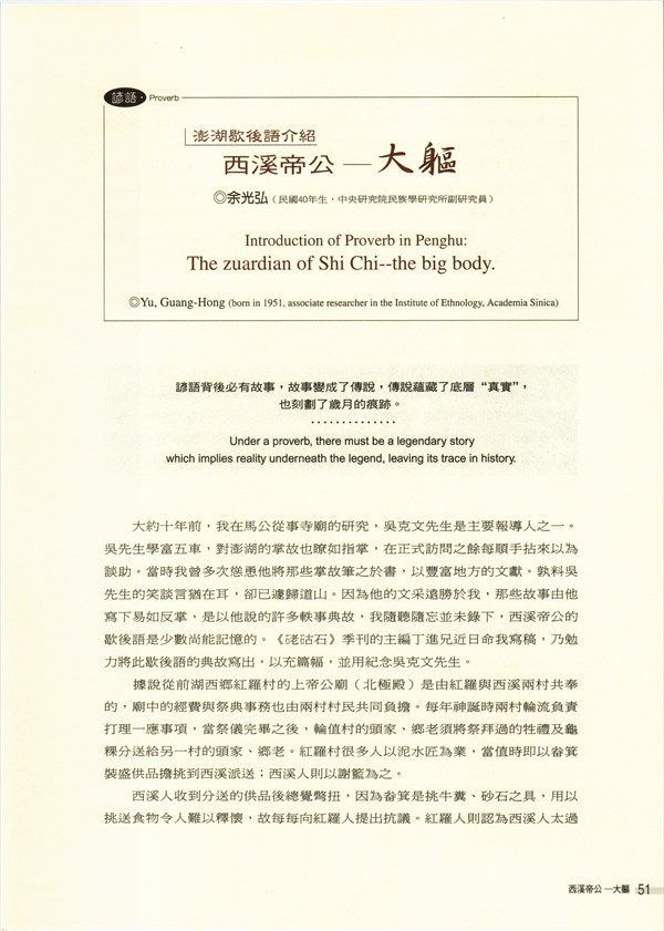 《硓古石》季刊第10期〈「澎湖歇後語介紹:西溪帝公-大軀」〉