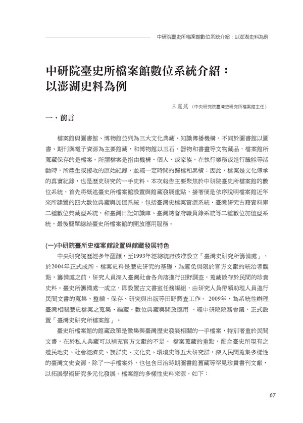 《澎湖研究學術研討會論文輯》第十二屆〈中研院台史所檔案館數位系統介紹: 以澎湖史料為例〉 -