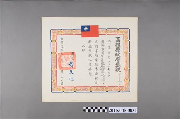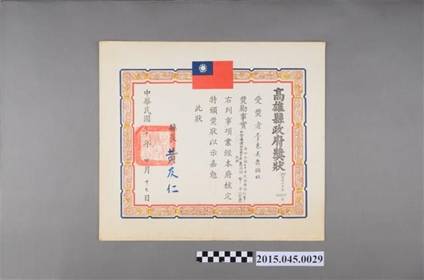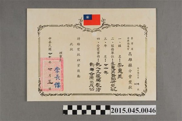 臺灣省音樂協進會高雄縣分會表彰李惠美舞蹈研究社熱心支援樂教活動獎狀