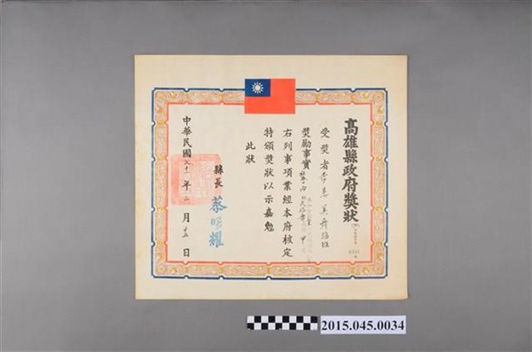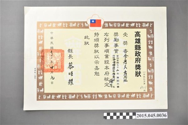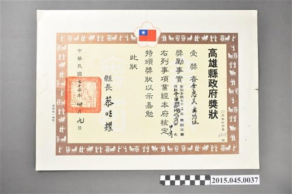 李惠美學生蔡玉芳參加高雄縣六十九年度中華民族舞蹈比賽兒童個人組中國古典舞優等獎狀 -