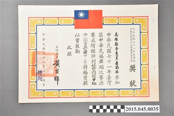 高雄縣李惠美舞蹈社參加臺灣區七十一年度中華民族舞蹈比賽社會團體甲組中國古典舞甲等獎狀 -