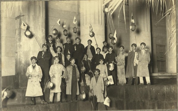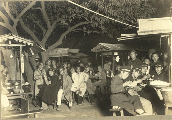 臺北高等學校1938年第11屆文甲班學生在路邊攤販品嚐小吃的情景 -