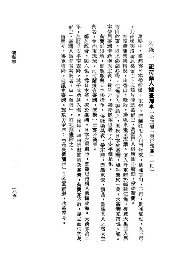 萬歷中臺灣為日本倭所據,末年荷蘭紅毛人自西洋來 靖海志附錄 台灣文獻史料叢刊 -