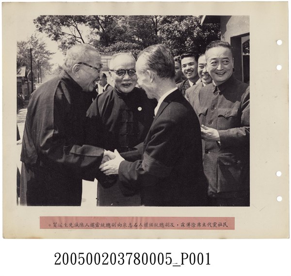 第一屆國民大會第二次會議珍輯《民社黨代主席徐傳霖及副總統候選人石志泉向副總統當選人陳誠先生道賀》照片 -