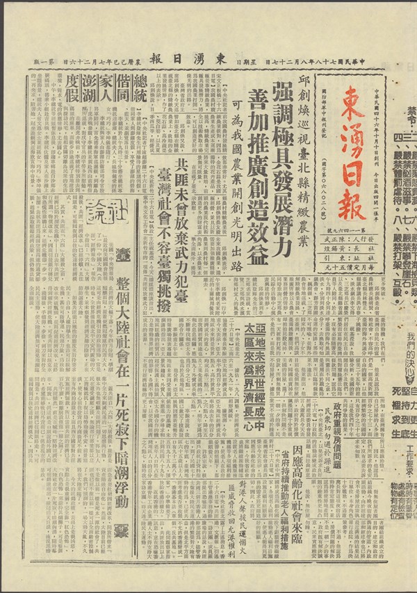 中華民國78年8月27日東湧日報第一一四六九期第一版 -