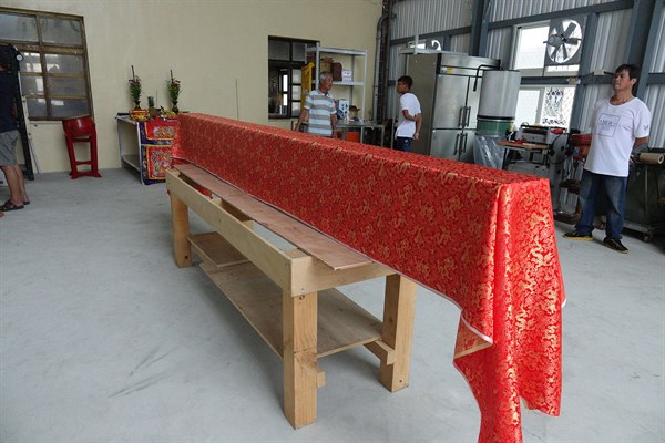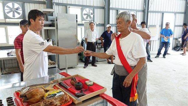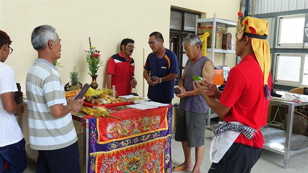 鎖港北極殿五府千歲千秋寶艦建造開斧儀式—五府千歲董事焚香祭拜王船龍骨 -