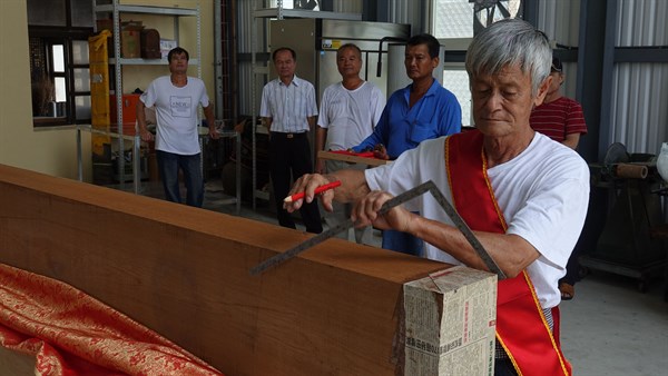 鎖港北極殿五府千歲千秋寶艦建造開斧儀式—魯班尺測量龍骨長度 -