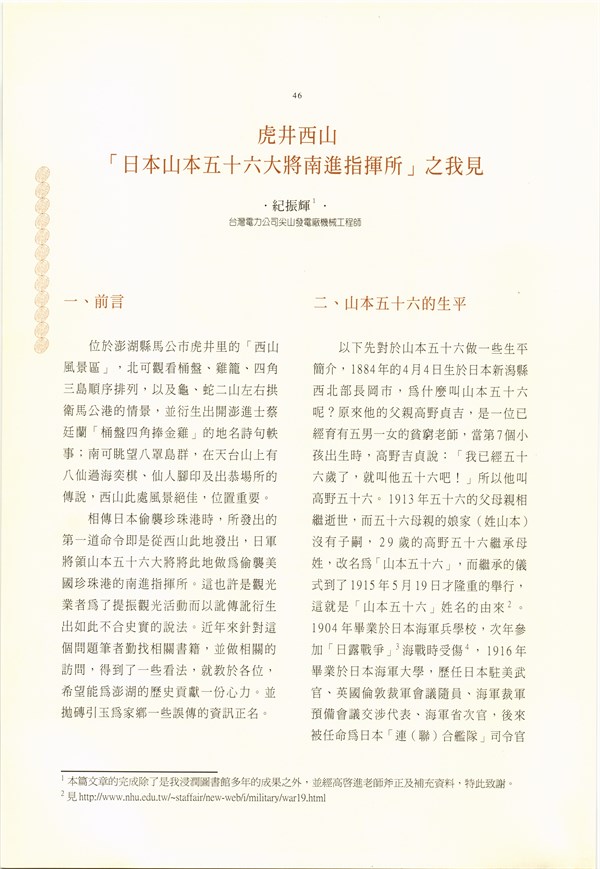 《西瀛風物》第十期〈虎井西山「日本山本五十六大將南進指揮所」之我見 〉 -