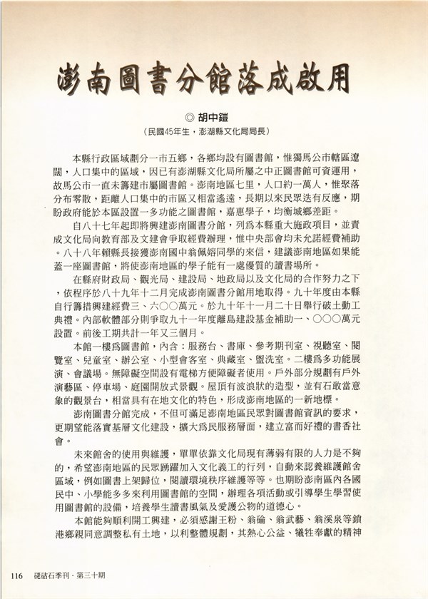 《硓古石》季刊第30期〈澎南圖書分館落成啟用〉 -