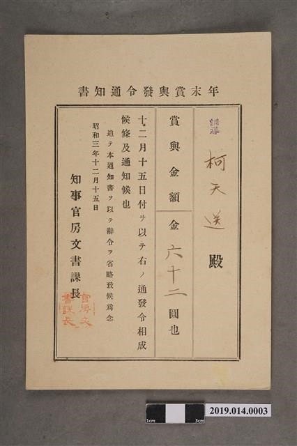 柯天送臺南州昭和3年12月15日年終獎金發放通知書 -