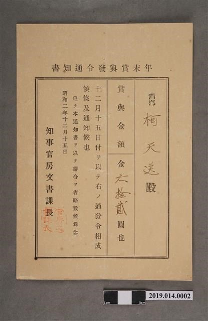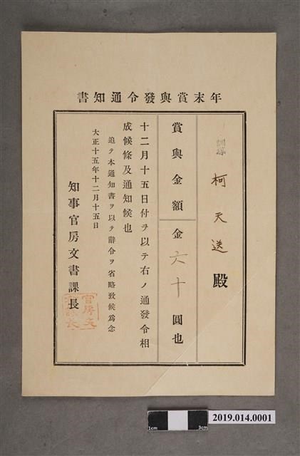 柯天送臺南州昭和2年12月15日年終獎金發放通知書 -