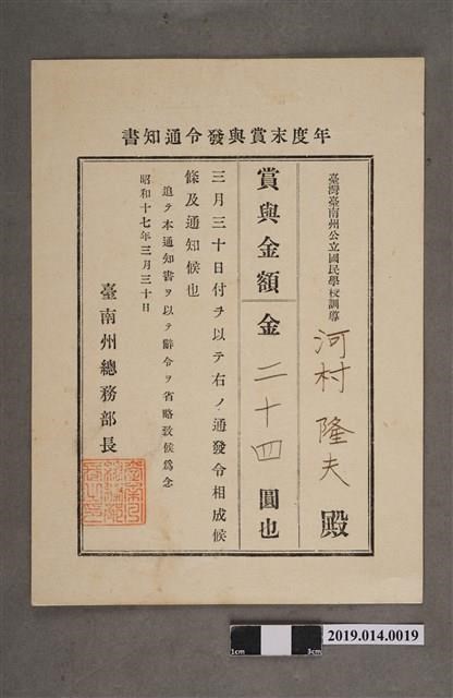 河村隆夫臺南州昭和17年3月30日年終獎金發放通知書 -