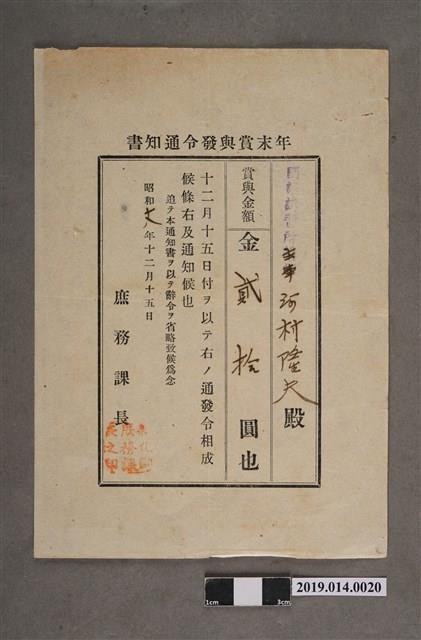 柯天送臺南州昭和13年12月15日年終獎金發放通知書 -