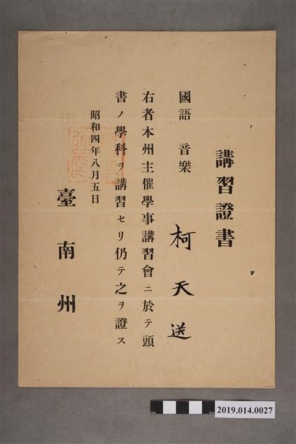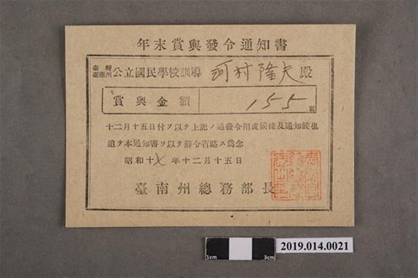 柯天送臺南州昭和14年12月15日年終獎金發放通知書 -