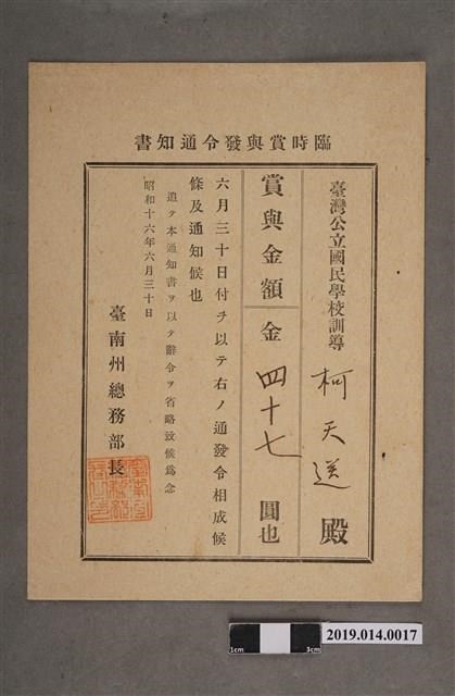 柯天送臺南州昭和16年6月3日臨時獎金發放通知書 -