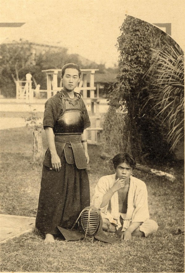 臺北高等學校1933年第6屆文甲班學生穿著劍道、柔道服裝在運動場旁的草坪上留影 -