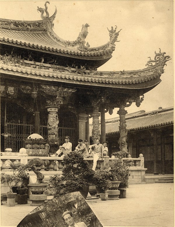 臺北高等學校1933年第6屆文甲班學生在艋舺龍山寺的正殿前坐在欄杆上合影 -