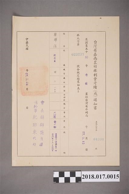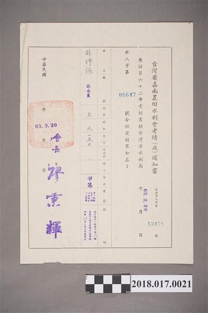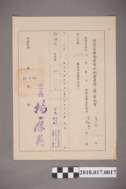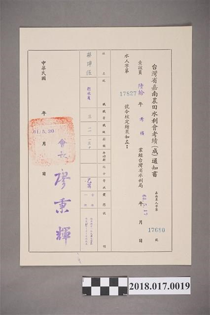 1967年臺灣省嘉南農田水利會發予林坤佐考績通知書 -