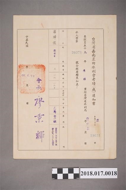 1971年臺灣省嘉南農田水利會發予林坤佐考績通知書 -