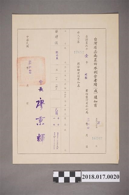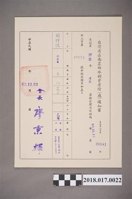1964年臺灣省嘉南農田水利會令發予林坤佐考成通知 -
