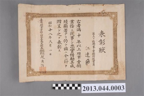 昭和18年(1943)第六0區煙草零售業務任職十年以上、成績優異表彰狀 -