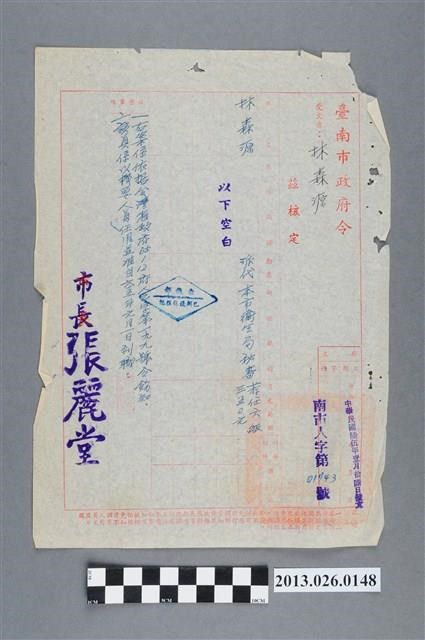 1976年1月16日臺南市政府派林森源擔任臺南市衛生局秘書之派令 -