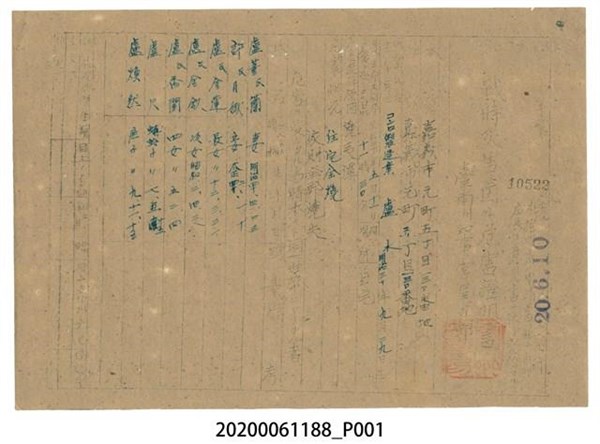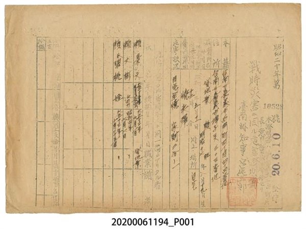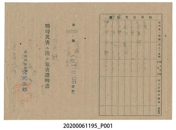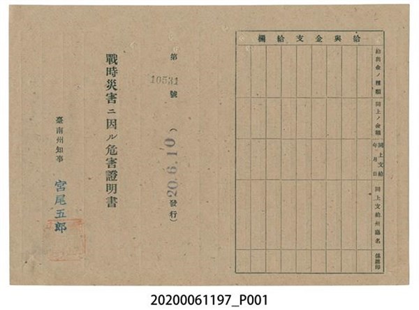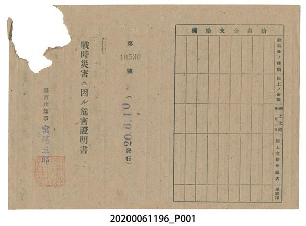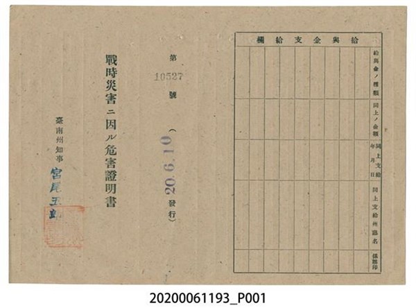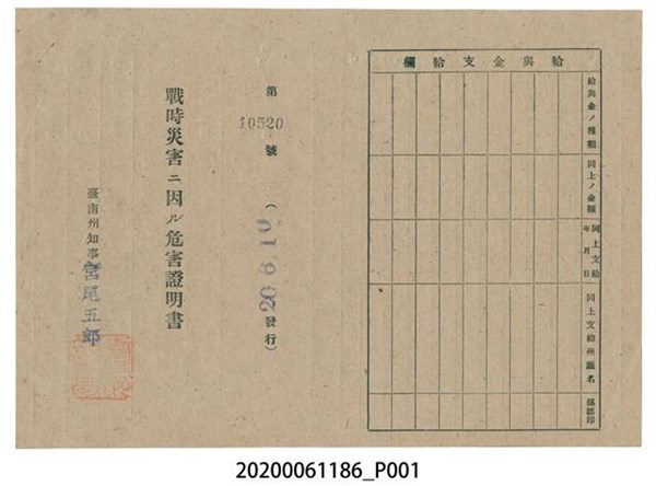 戰時造成的意外災害證明書第10520號(昭和20年6月10日發行) -