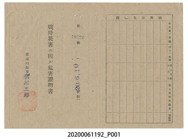 戰時造成的意外災害證明書第10526號(昭和20年6月10日發行) -
