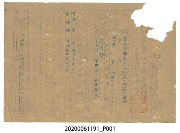 戰時造成的意外災害證明書第10525號(昭和20年6月10日發行) -