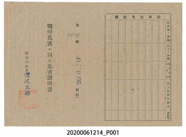 戰時造成的意外災害證明書第10549號(昭和20年6月10日發行) -