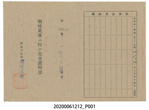 戰時造成的意外災害證明書第10547號(昭和20年6月10日發行) -