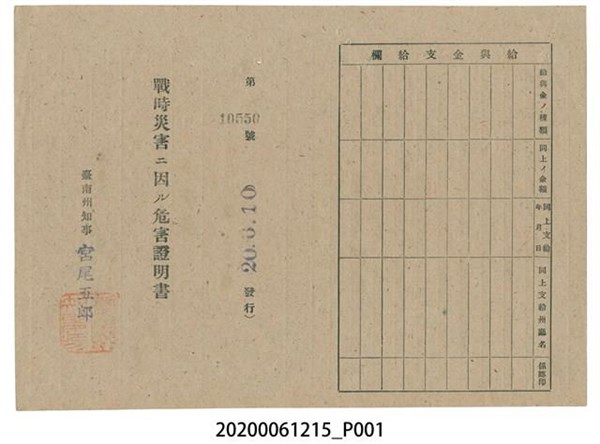 戰時造成的意外災害證明書第10550號(昭和20年6月10日發行) -