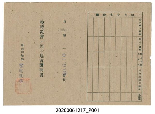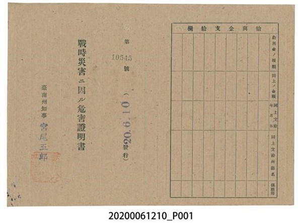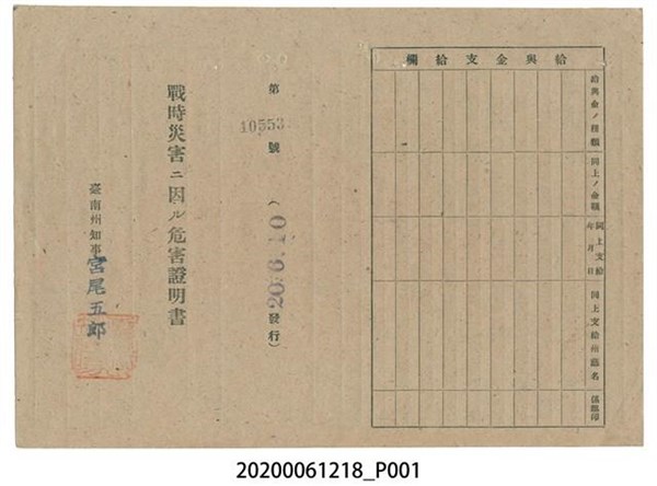 戰時造成的意外災害證明書第10553號(昭和20年6月10日發行) -
