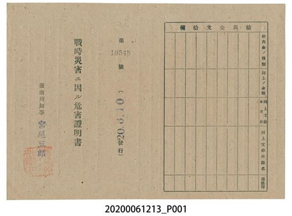戰時造成的意外災害證明書第10548號(昭和20年6月10日發行) -