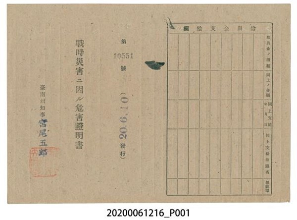 戰時造成的意外災害證明書第10551號(昭和20年6月10日發行) -