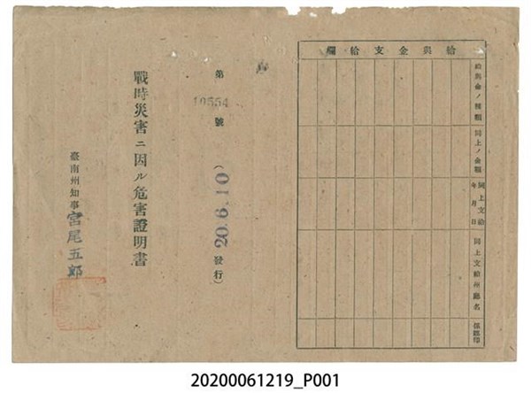戰時造成的意外災害證明書第10554號(昭和20年6月10日發行) -