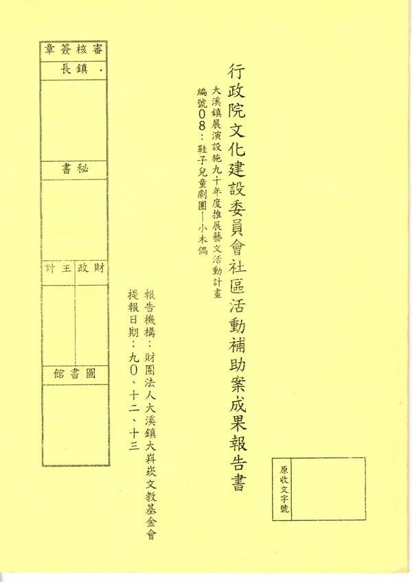 行政院文化建設委員會社區活動補助案成果報告書大溪鎮展演設施九十年度推展藝文活動計畫編號08:鞋子兒童劇團─小木偶
