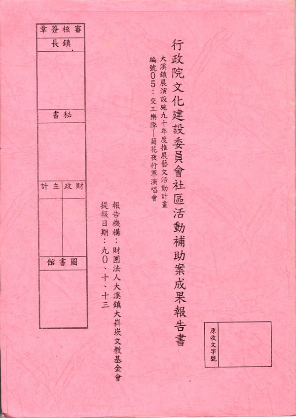 行政院文化建設委員會社區活動補助案成果報告書大溪鎮展演設施九十年度推展藝文活動計畫編號05:交工樂隊─菊花夜行軍演唱會 -